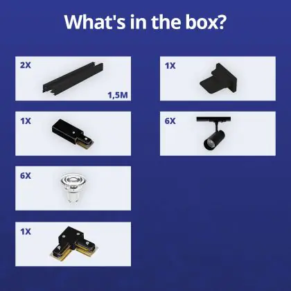 | Fabrikantnaam | Complete L shaped 1-Phase Track Set Black incl. 6x Spot fixture + GU10 2700K 3W Dim – 1,5 x 1,5 mete | |