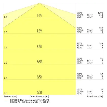 ![]() De kleurcode is een combinatie van de kleurweergave (CRI) en lichtkleur (Kelvin). Het eerste getal is de kleurweergave (1 = zeer slechte kleurweergave, 9 = maximale kleurechtheid). Het tweede en derde cijfer betreft de lichtkleur. Een lamp met kleurcode 830 heeft bijvoorbeeld een goede kleurweergave en straalt een warm wit licht uit (3000K), waar een lamp met de kleurcode 940 een uitstekende CRI heeft en een koel wit licht (4000K) uitstraalt. |